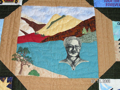 This block was in the very center of the quilt. It looks like Bear Lake where Grandma and Grandpa spend a lot of summer time with their family. Loretta again loaned me her machine to do the embroidered tree. Deb Walker, a wonderful family friend, painted/drew the picture of him.